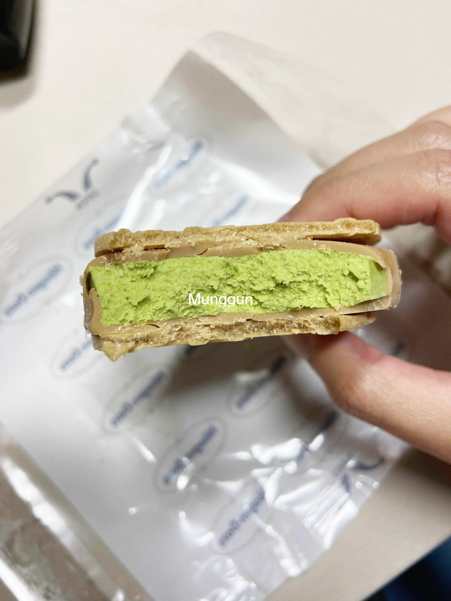 먼저 그린티를 먹어보기로 했다. 칼로리는 개당 300kcal를 훌쩍 넘는다. 뭐, 샌드위치 아이스크림이라고 해서 어느정도 예상은 했다.