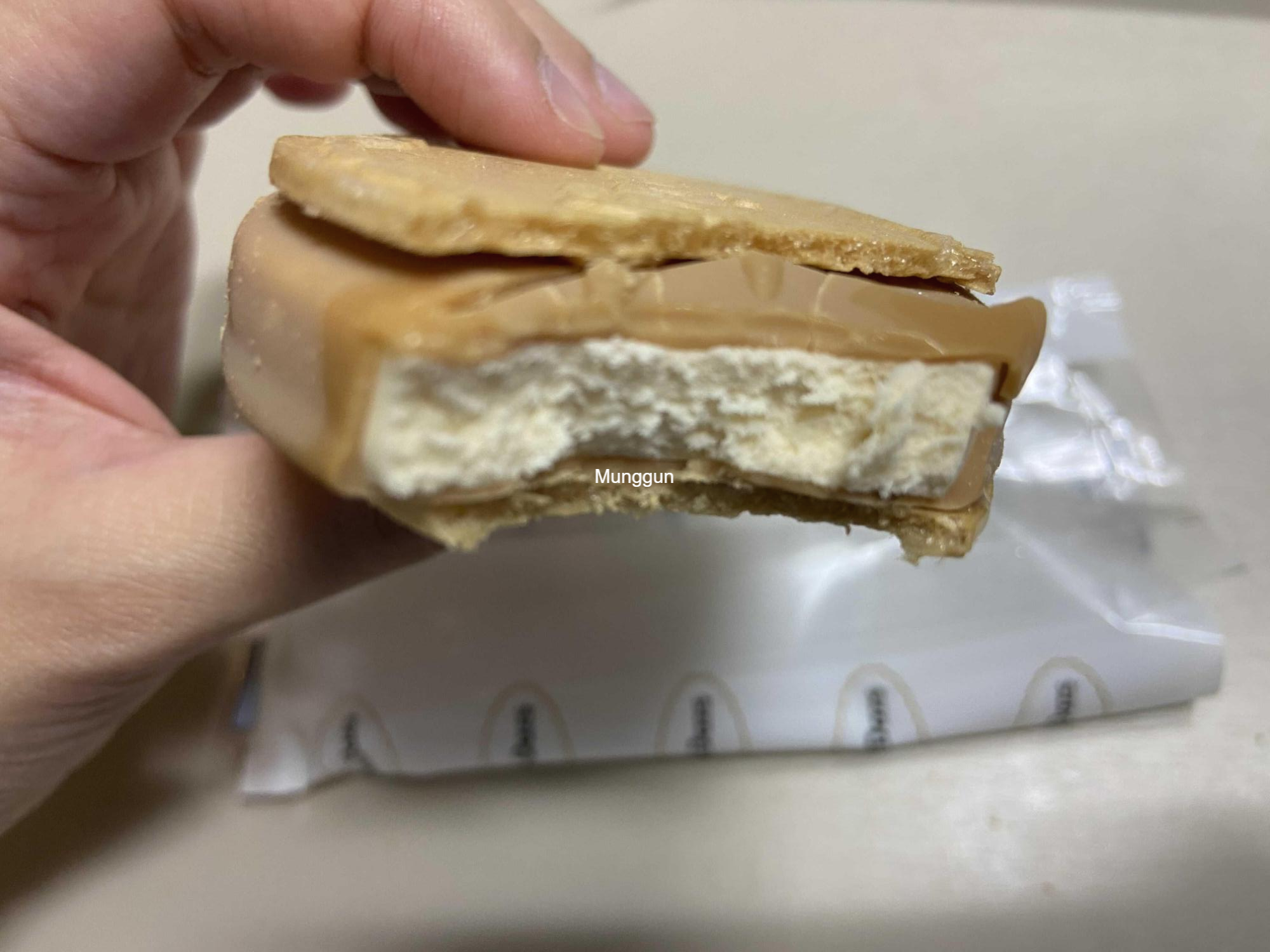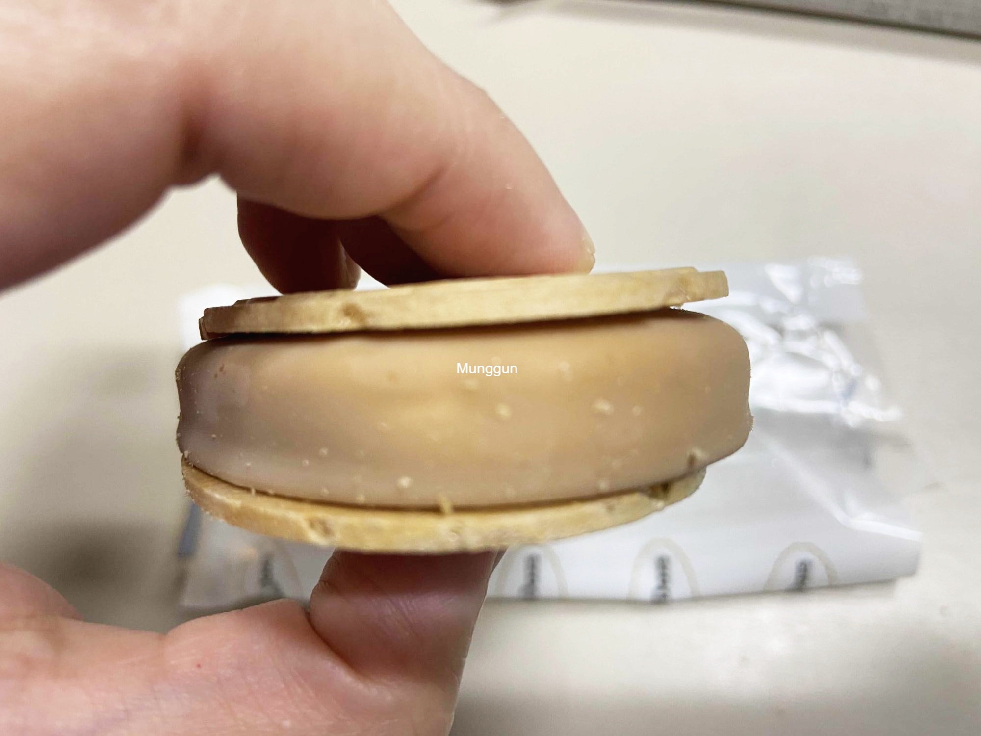 아이스크림 크기는 내 손바닥만하다. 생각보다 샌드가 두툼하다. 마치 속이 꽉 찬 뚱카롱같다.