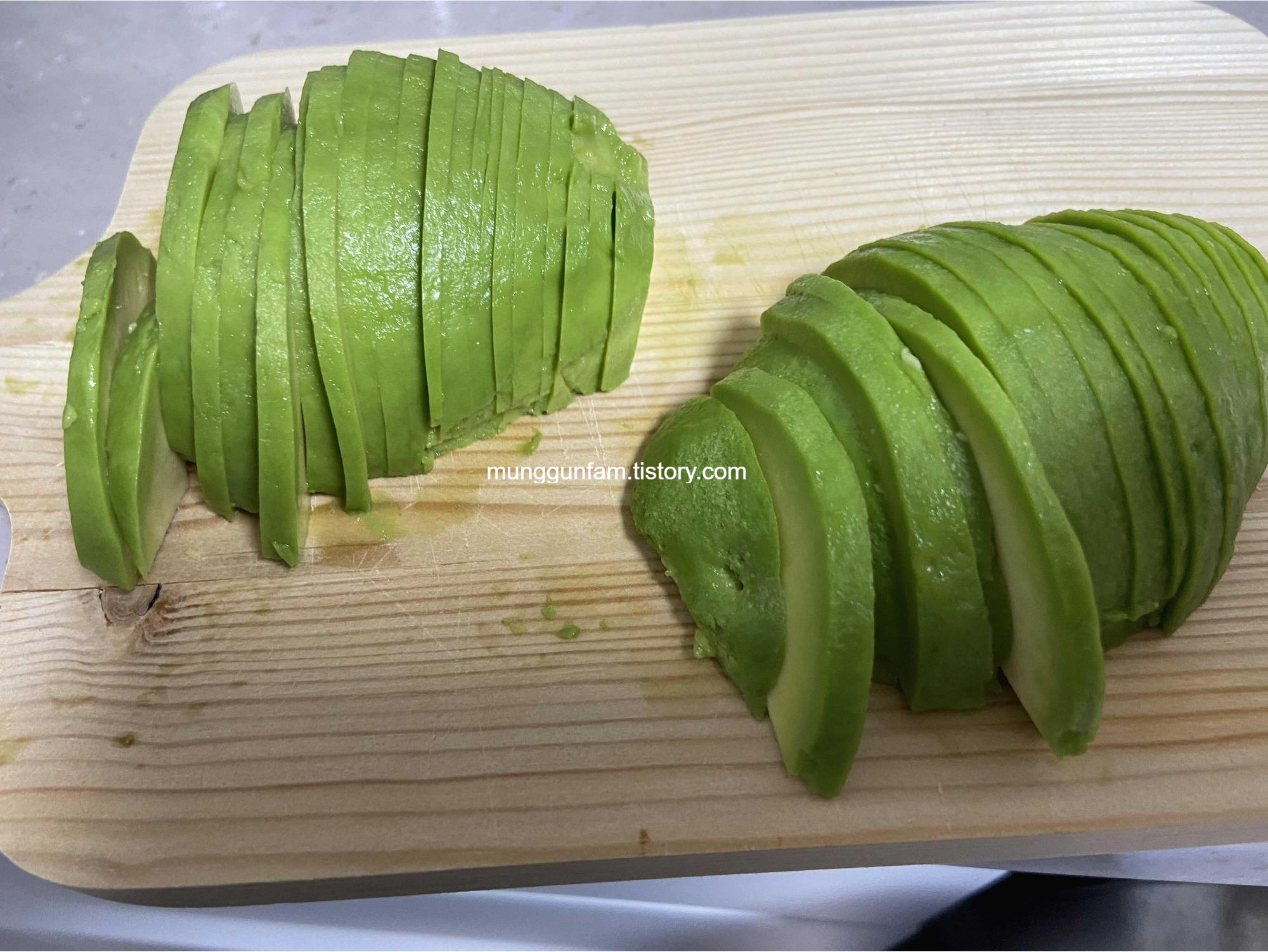 누군가의 포스팅에서 아보카도를 촘촘하게 썰어야 보기 좋다는 글을 봐서 나름 얇게 썰었다.