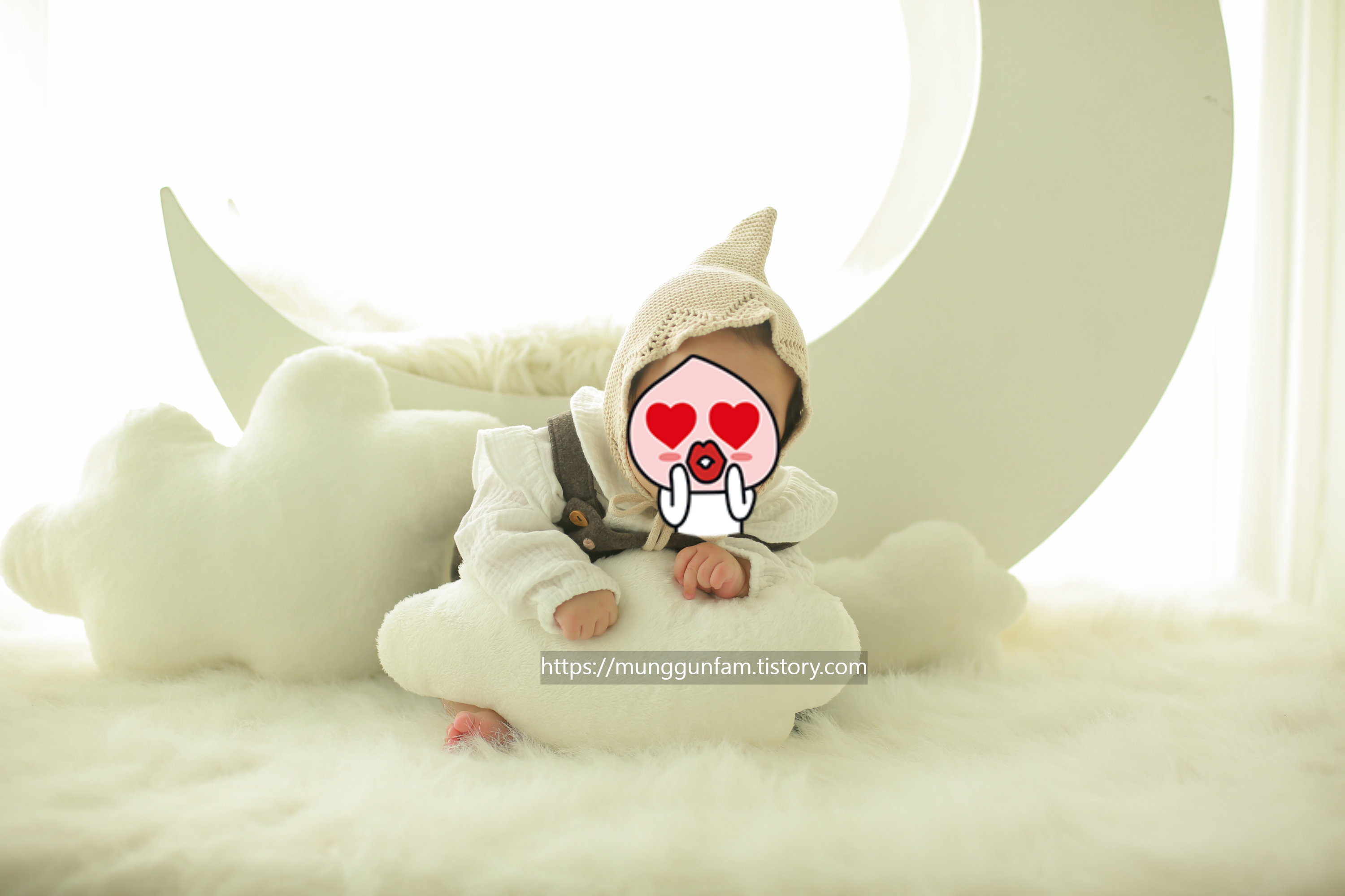 저는 다양한 사진 촬영 컨셉 중에 루나, 블러썸을 골랐어요. 곰돌이랑 좀 고민했는데.. 작가님이 루나와 블러썸이 최근에 만든 컨셉이라고 귀띔해주셔서 선택! 근데 결과가 완전 대대대대만족이에요! 아래 우리 아가 원본 사진 보여드릴게요.